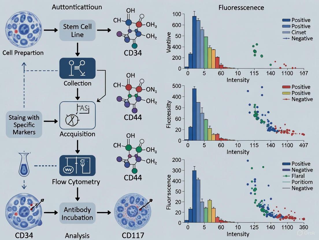 Flow cytometry offers a powerful platform for stem cell authentication by enabling simultaneous measurement of multiple cellular parameters. Its principle involves passing a single-cell suspension through a laser beam, where light scattering and fluorescence signals are detected and quantified [2]. This technology provides several distinct advantages for authentication: