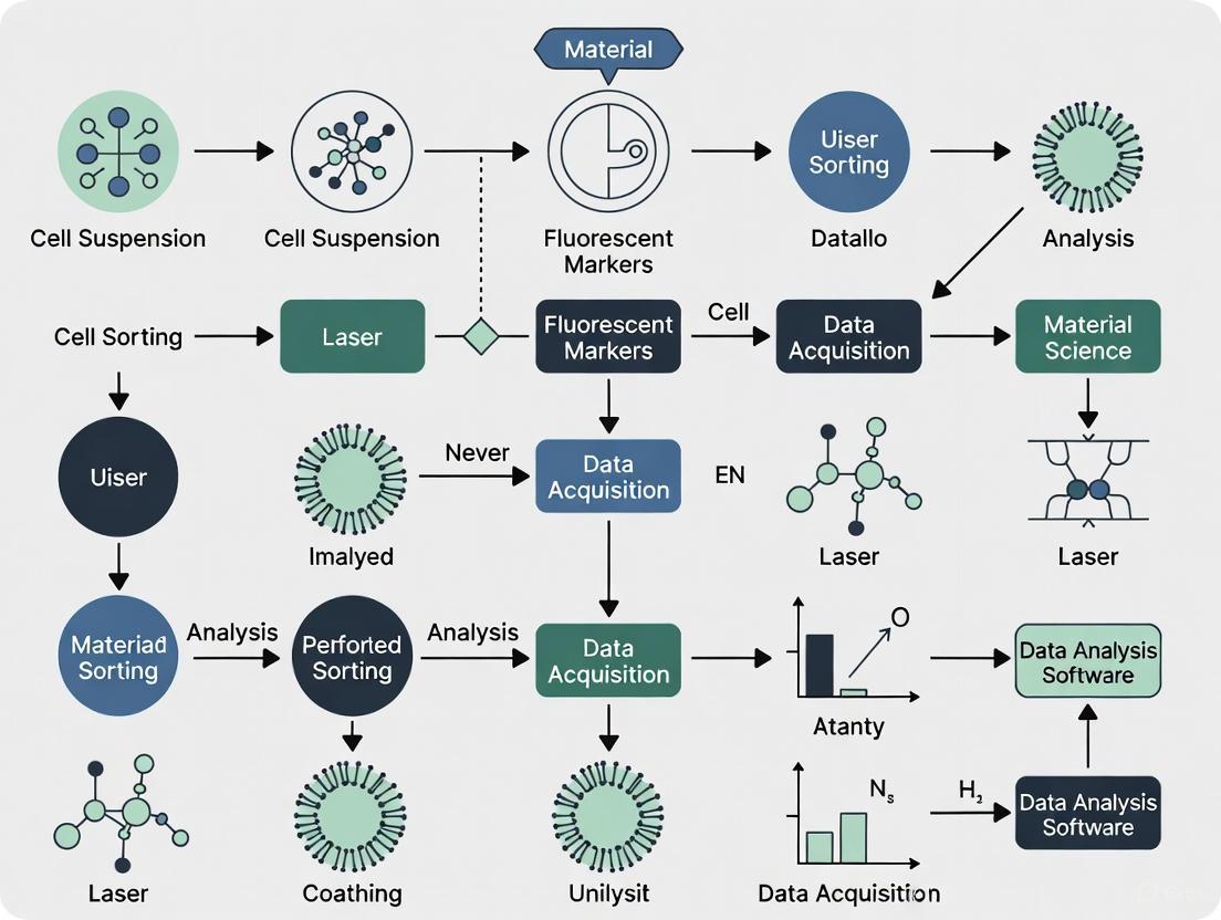 When cells are labeled with fluorochrome-conjugated antibodies specific to cellular markers, the laser excites the fluorophores, resulting in the emission of fluorescent light at specific wavelengths. This fluorescence is collected by detectors, and the data is digitized for analysis [22]. The resulting data can be displayed in various formats, such as histograms (single parameter) or dot plots (two parameters), and specific cell populations can be isolated for further study by setting graphical boundaries known as "gates" [22].